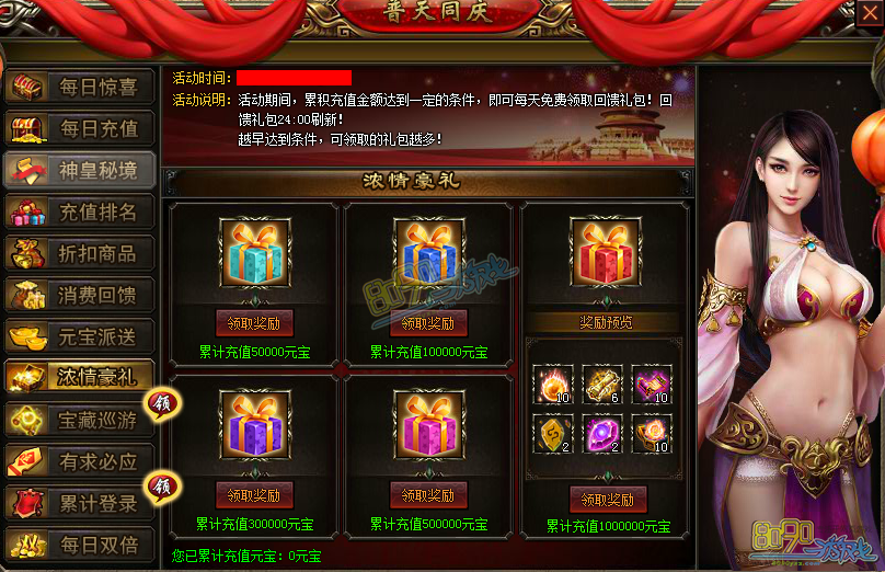 【活动说明】:活动期间,累计充值金额达到一定的条件,即可每天免费领取回馈礼包!回馈礼包24:00刷新!越早达到条件,可领取的礼包越多!