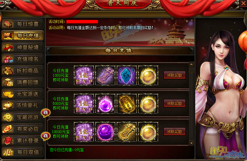【活动说明】:每日充值金额达到一定条件时,可领取一份奖励。
