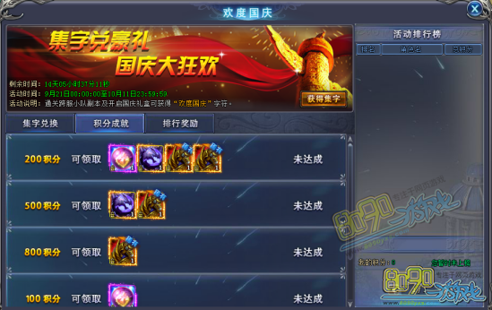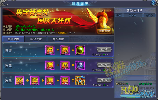 在活动期间玩家通过跨服小队副本或打开国庆礼盒可获得“欢度国庆”4个字符,使用字符搭配可以兑换道具,每一次兑换道具都会获得成就积分,当积分达到一定值即可获得积分成就奖励,同时还会有积分排行榜,兑换越多积分越多奖励越多!!!排行名次越高还可获得额外排行奖励!
