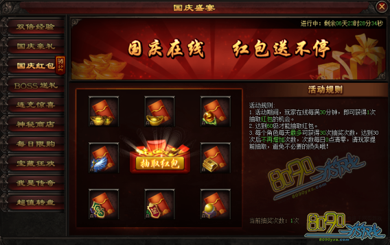 1. 活动期间,玩家每在线满30分钟,即可获得一次抽取红包的机会;