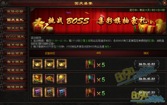 1. 活动期间,每日10:00~22:00,每2个小时沙漠土城将会出现诸多BOSS,击杀BOSS将有几率掉落各种颜色的彩旗,使用彩旗可抽取丰厚的奖励。