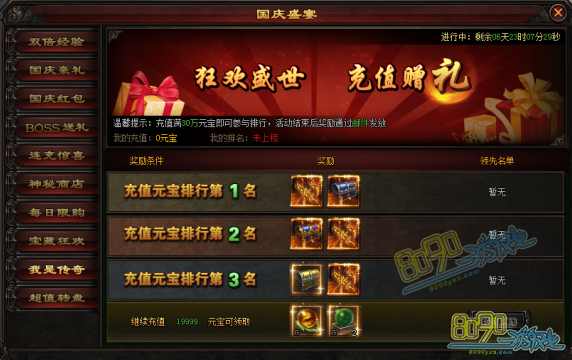充值元宝排行第2名:元古神皇神器宝箱*1、【幻】国庆龙魂(武器)*1(15天)