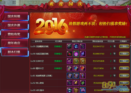 【活动内容】:活动期间,玩家每天可通过免费扫荡,轻松拿奖励!
