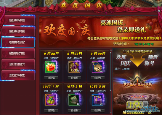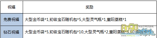 免费祝福大型金币袋*1,初级宝石随机包*5,大型灵气瓶*1,重阳蒸糕*1