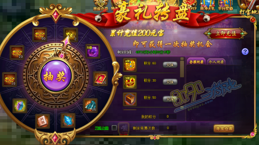 活动规则:活动期间内,玩家每累计充值200元宝,即可获得一次抽奖机会,抽奖可获得珍贵道具和积分,积分可额外兑换稀有道具。