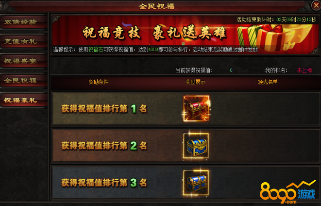 活动期间,获得祝福值达到4000以上即可参与排名,排名前三可以获得排名奖励
