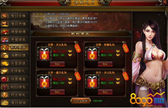 【活动说明】:活动期间,可购买多种折扣商品,全场最低低至4折!可消耗50元宝进行刷新,每天最多可刷新100次!全部购买后,将自动免费刷新!