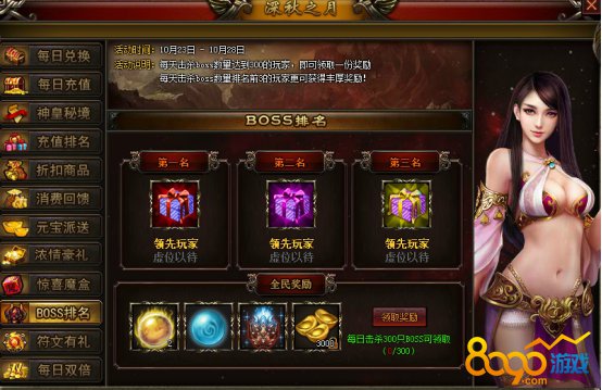 【活动说明】:每日击杀boss数量达到300的玩家,即可领取一份奖励。击杀排名前三名的玩家更有丰厚奖励!