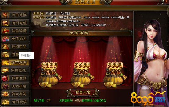 【活动说明】:活动期间,每天累计充值达9999、49999、99999、299999、499999,即可获得一次元宝赚元宝的机会。