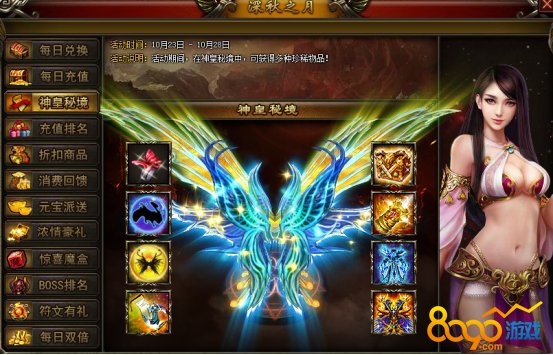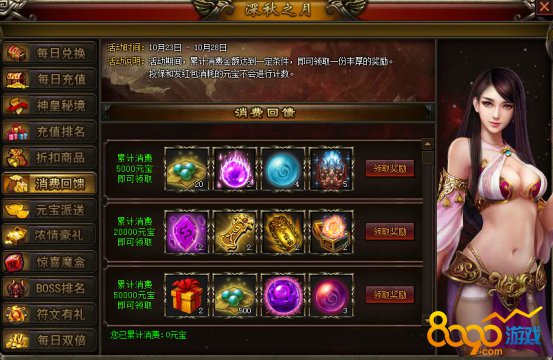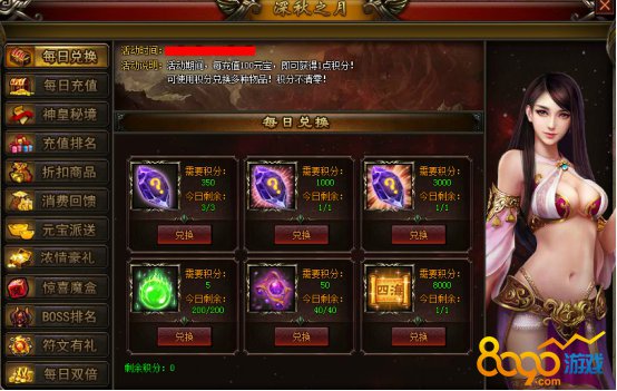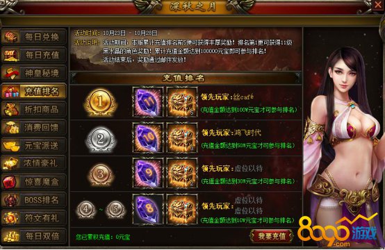 【活动说明】:活动期间,每充值100元宝,即可获得1点积分!可使用积分兑换多种物品!积分不清零!