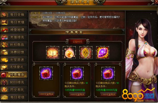 【活动说明】:活动期间,可购买超值的惊喜魔盒,达到一定条件后,更可享受折扣福利!使用魔盒,可获得多种超值奖励。
