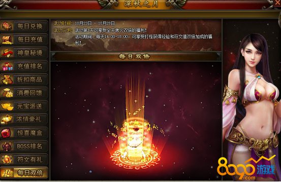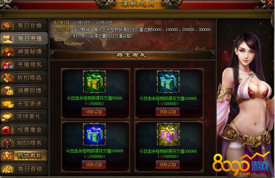 【活动说明】:活动期间,每天击杀怪物获得的符文值达到50000、100000、200000、300000时,即可获得大量的符文值奖励!