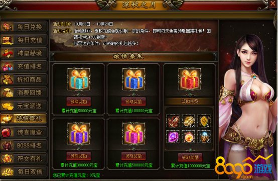 【活动说明】:活动期间,累计充值金额达到一定条件,即可每天免费可领取回馈礼包!
