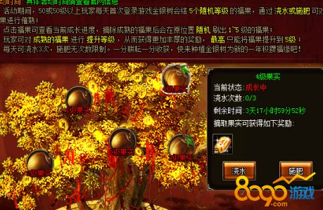 活动期间,玩家首次打开活动面板时金银福树会结除5个随机等级的福果,玩家可通过浇水或施肥进行催熟。每个果实最多只能浇水3次;施肥可使果实直接成熟,无次数限制。果实成熟后,玩家可点击摘取按钮领取奖励,并可对成熟的福果提升等级获得更丰厚奖励。注意玩家需要到达50级才可以摘取果实。