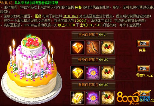 活动期间玩家可免费领取全民百服礼包,礼包内含蛋挞,可在土城蛋糕盘提交获得经验奖励并增加蛋糕进度,蛋糕进度到达10000后完成。蛋糕完成后,活动最后一天晚上20:00会在土城刷出BOSS钢背刃魔,BOSS存活时间60分钟,BOSS刷出同时会降下金钱雨。