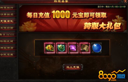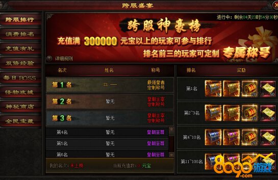 活动内容:活动期间,充值满30万元宝,即可参与跨服充值排名,前100名可获得丰厚奖励回馈。