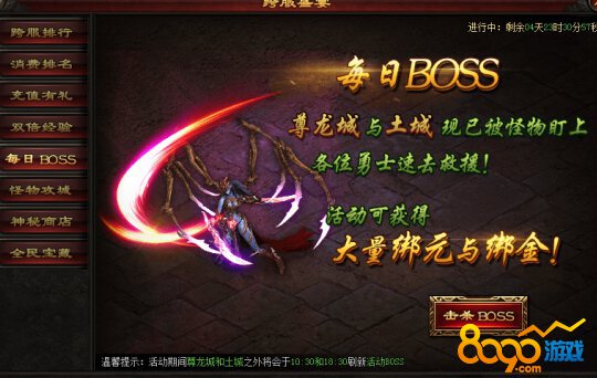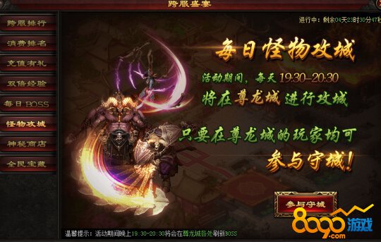活动期间,每天19:30~20:30将在尊龙城刷新BOSS,所有在尊龙城的玩家均可参与守城。