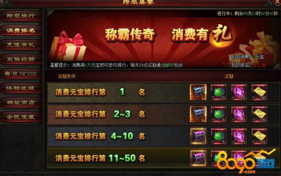 活动内容:活动期间,每日消费满1万元宝即可参与排行,奖励每日发放并重置消费金额,奖励将通过邮件发放。