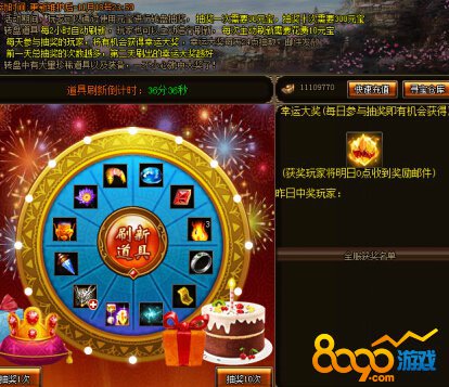 活动期间,玩家可以在面板进行转盘抽奖,抽奖一次需要30元宝,抽奖十次需要300元宝,转盘道具每2小时自动刷新,可以花费10元宝手动刷新,手动刷新不影响自动刷新时间。同时,每天将在参与抽奖的玩家中抽取一名派送幸运大奖,幸运大奖将在每天24点抽取并以邮件发送给中奖玩家。前一天抽奖次数越多,刷出的幸运大奖越好,同时抽奖次数越多中奖机会越大。