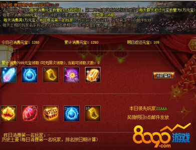活动期间,玩家每天的消费元宝将获得15%返还,返还上限1万元宝,返还元宝将在第二天0点以邮件形式发放。玩家每累计消费2999元宝即可增加一次累计消费奖励领取次数,不限领取次数,每天不重置。同时,每天消费满1万元宝即可参加消费排行,每天排行第一的玩家可获得奖励,奖励第二天0点以邮件形式发放。