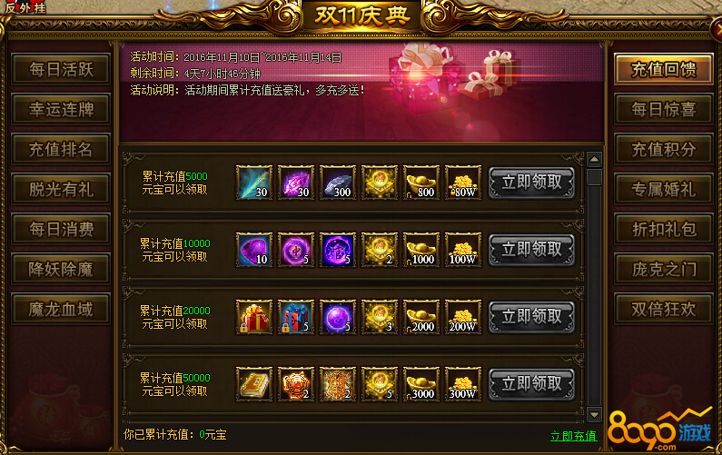 活动内容:活动期间,真情回馈玩家,每天消费一定元宝即可领取超级回馈!消费越多,回馈越丰厚!