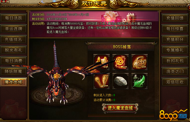 活动内容:活动期间,每消费50000元宝,即可获得1次进入魔龙血域的机会。击杀魔龙血域的魔龙BOSS将掉落大量坐骑装备,还有一定机会掉落橙色坐骑装备!等级达到60级才能进入魔龙血域。