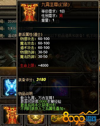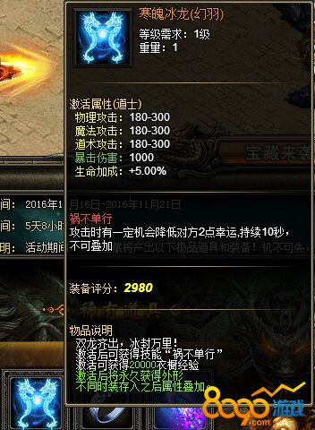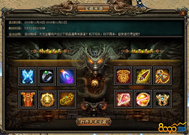 活动内容:活动期间,天龙宝藏将产出寒魄冰龙(幻羽)、神力戒指、九霄至尊(幻装)、神工鬼力以及战天传奇套装等极品装备,快来寻宝吧!