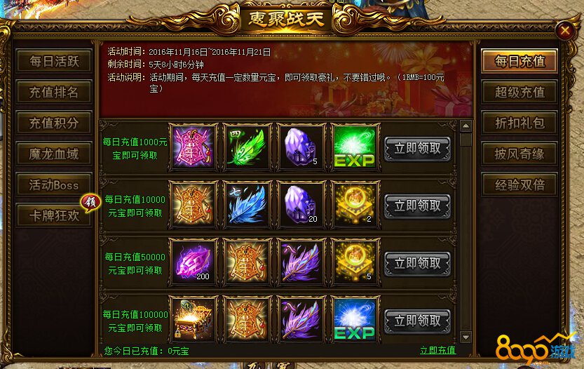 活动内容:活动期间,每天充值一定数量元宝,即可领取豪礼!不要错过哦!