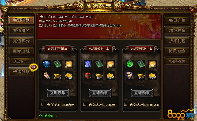 活动内容:活动期间,每天活跃值达到要求即可领取丰厚活跃礼包。