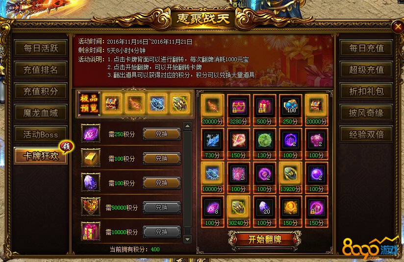 活动内容:1.点击卡牌背面可以进行翻转,每次翻牌消耗1000元宝。2.点击开始翻牌,可以开始翻转卡牌。3.翻出道具可以获得对应的积分,积分可以兑换大量道具。
