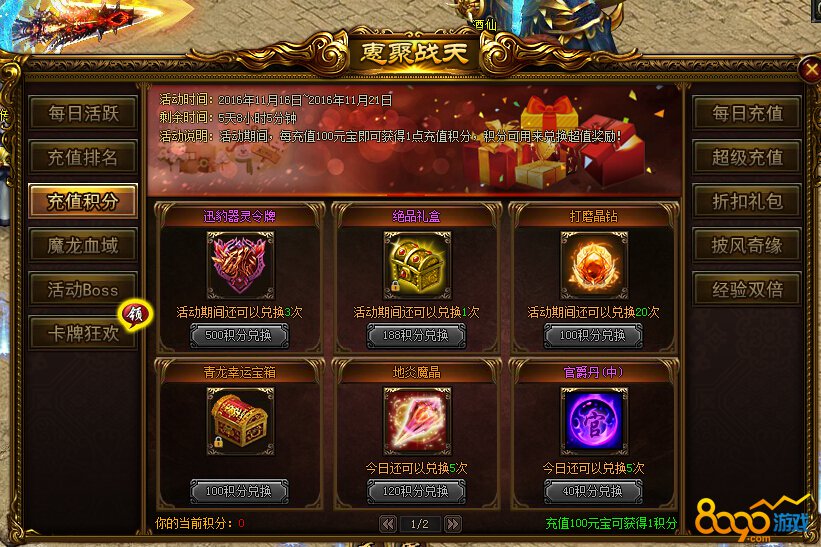 活动内容:活动期间,每充值100元宝即可获得1点充值积分,积分可以用来兑换超值奖励!