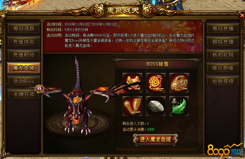 活动内容:活动期间,每消费50000元宝便可获得一次进入魔龙血域的机会,击杀魔龙Boss,即可掉落大量坐骑装备,有机会获得橙色坐骑装备哦!等级达到60级才能进入魔龙血域。