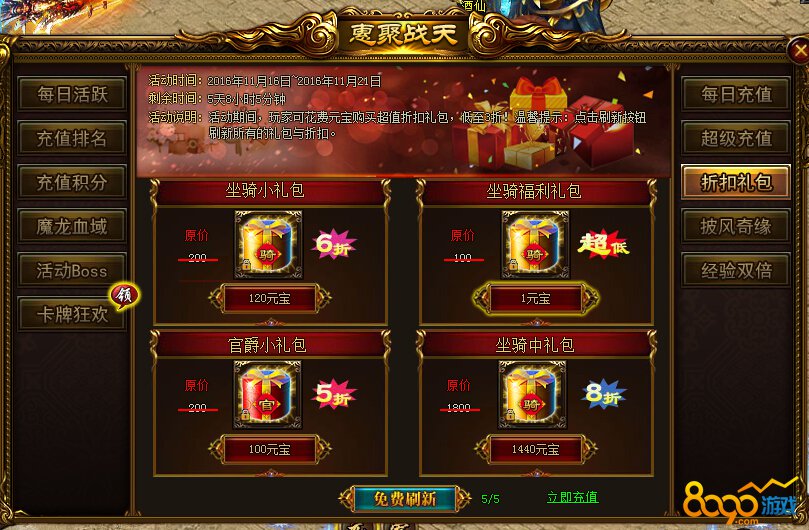 活动内容:活动期间,玩家可花费元宝购买超值礼包,低至3折!温馨提示:点击刷新按钮刷新所有的礼包与折扣。