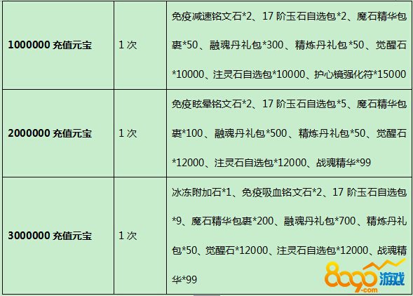 活动内容:活动期间,每日充值1000元宝即可领取当天奖励,最后1天需要充值10000元宝才可领取。