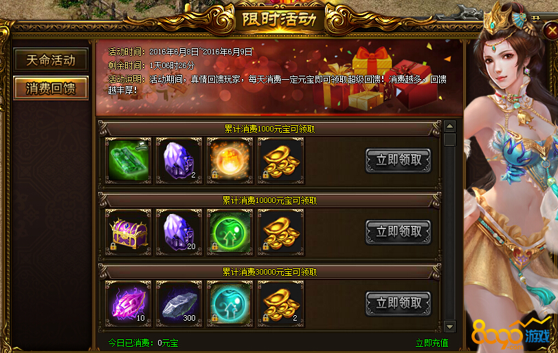 活动说明:活动期间,真情回馈玩家,每天消费一定元宝即可领取超值回馈!消费越多,回馈越丰厚!