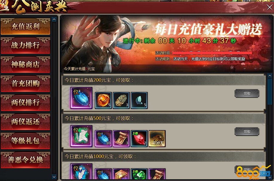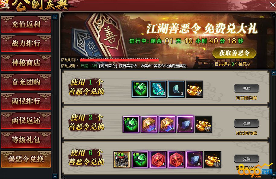 活动规则:每日首冲获得善恶令,收集6个善恶令兑换海量奖励