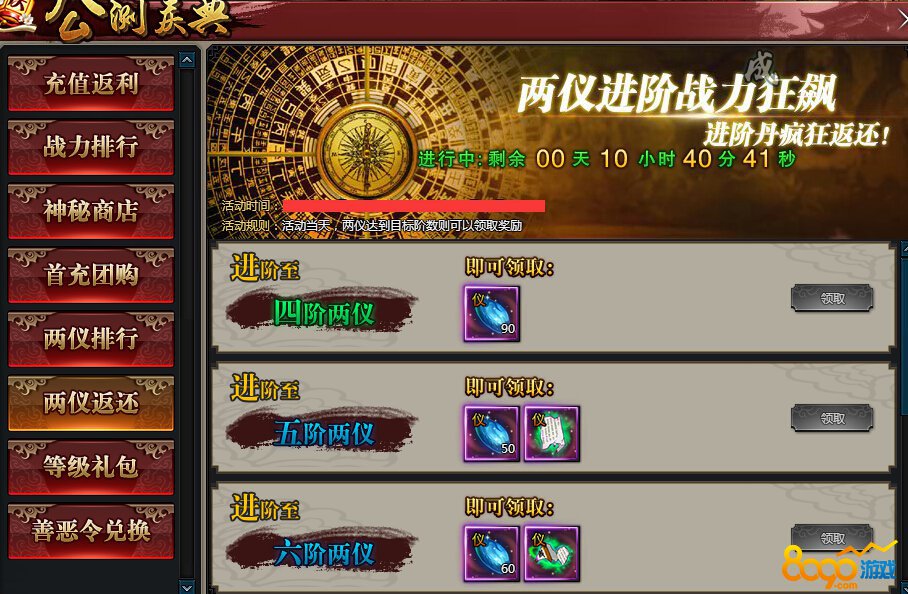 活动规则:两仪阶数越高,系统战力越强,排名越靠前(请于结算点5分钟完成战力提升,避免不必要的损失)