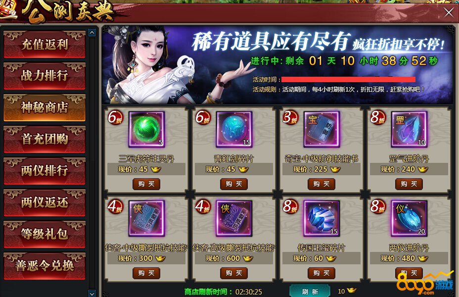 活动规则:活动期间, 每4小时刷新1次随即珍贵道具,折扣无限,赶紧抢购