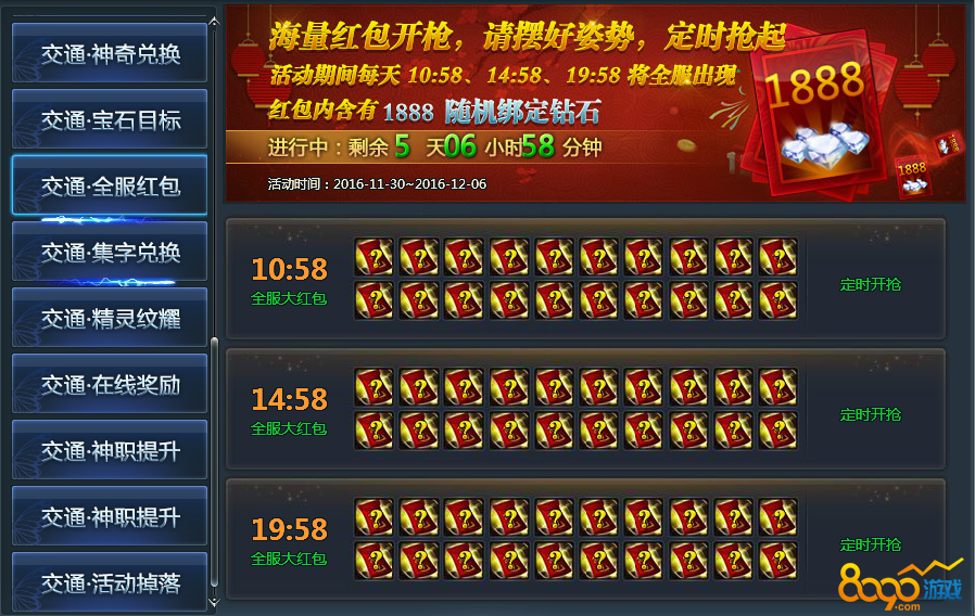 【活动内容】:活动期间每天10:58,14:58,19:58系统将定时发放全服红包,海量钻石红包开抢,请摆好姿势,定时抢起!