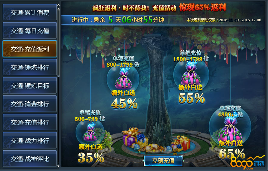 【活动内容】:活动期间,史无前例的充值返利活动到来!你充值,我白送,疯狂返利!