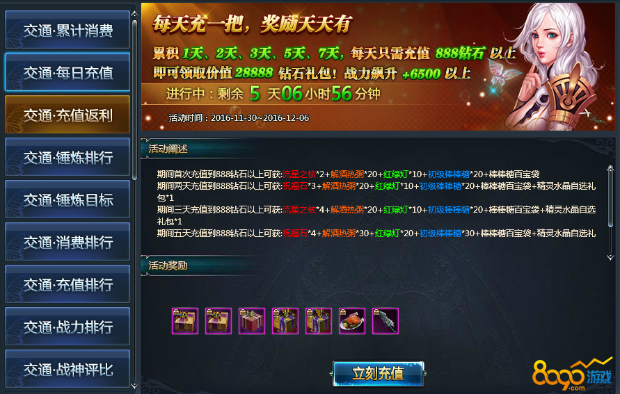 【活动内容】:活动期间,小充一把玩玩,奖励大把爽爆!累计1天、2天、3天、5天,7天,每天仅需充值888钻石以上,即可领取价值28888钻石大礼包!战力飙升6500+!