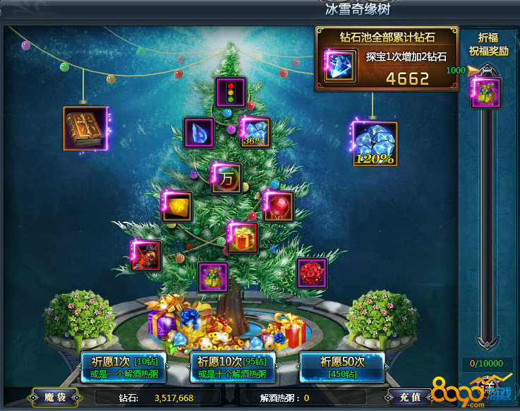 【活动内容】:活动期间永恒城出现奇缘树,树上结满了红绿灯、幸福水晶等各种珍惜道具,并且有概率获得钻石奖池中的钻石,只要在树下用解酒热粥或花费钻石即可摇动摇钱树,每次摇动都有概率掉落树上宝物;同时,每次摇树都可以获得一定的祈愿祝福值,当祝福值达到一定数量的时候,即可获得一份特殊的奖励!