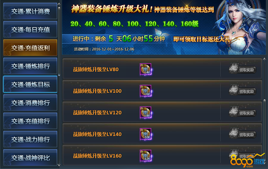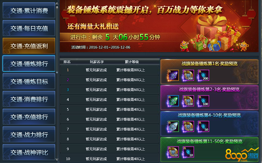 【活动内容】:战旗装备锤炼升级大礼!战旗装备锤炼等级达到20、40、60、80、100、120、140、160级,即可获得目标返还大礼
