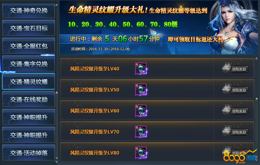 风精灵纹耀升级至LV80,即可领取300个精灵纹耀石;