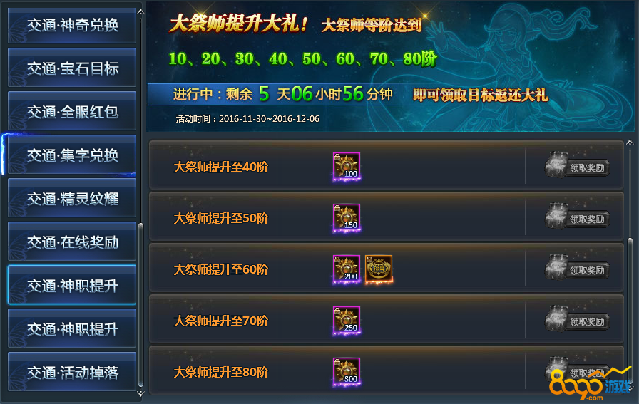 【活动内容】:大祭师提升拿大礼! 活动期间,大祭师等阶达到10、20、30、40、50、60、70、80级,即可领取目标返还大礼;
