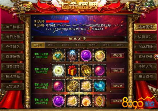 【活动说明】:每日充值20000、50000、100000、200000元宝的天数累计达到1、2、3、4、5、6、7天即可领取丰厚的奖励!