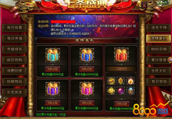 【活动说明】:活动期间,累计充值金额达到一定的条件,即可每天免费领取回馈礼包!回馈礼包24:00刷新!越早达到条件,可领取的礼包越多!