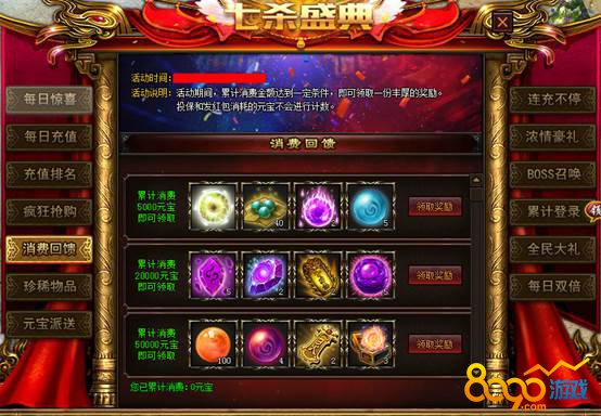 【活动说明】:活动期间,每天累计充值达9999、49999、99999、299999、499999元宝,即可获得一次元宝赚元宝的机会。每次需要消耗的数量不等的元宝,可获得三大元宝奖励之一。