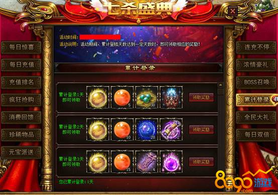 【活动时间】:活动期间,累计登陆天数达到一定条件时,即可领取相应的奖励!