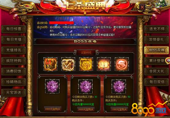 【活动说明】:活动期间,可购买超值的BOSS召唤令,达到一定条件后,更可享受折扣福利!